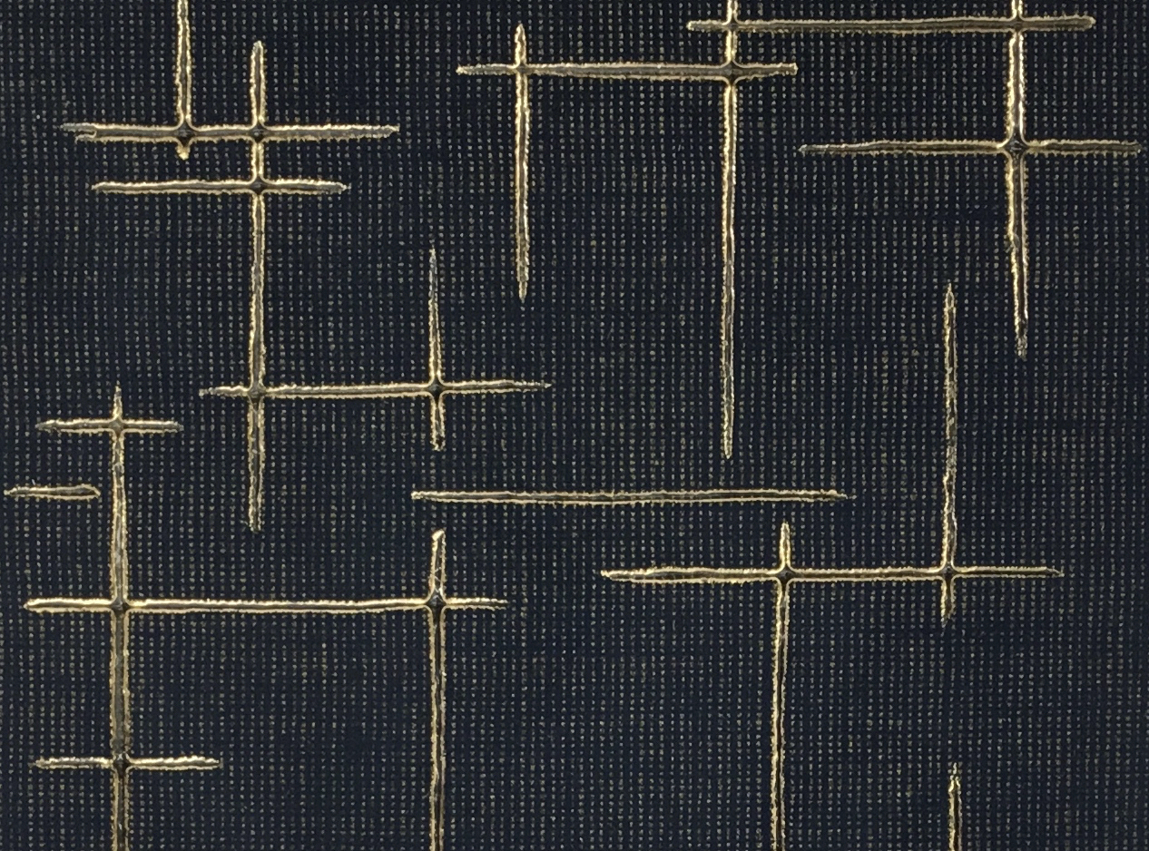 Tulle ennobli en dégradé de paillette d'or et transparente, laminé entre un verre transparent et un verre miroir.